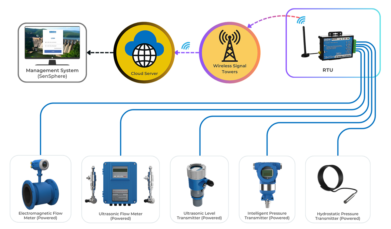 SBEM’s Smart Water Management System with powered devices overcomes these challenges by integrating level transmitters, flow meters, pressure transmitters, and an optional RTU (with RS485 communication input along with Analog & Digital input) for IoTbased connectivity to enable seamless data transmission via IoT web app (SenSphere) These devices can be powered through an optional solar supply.